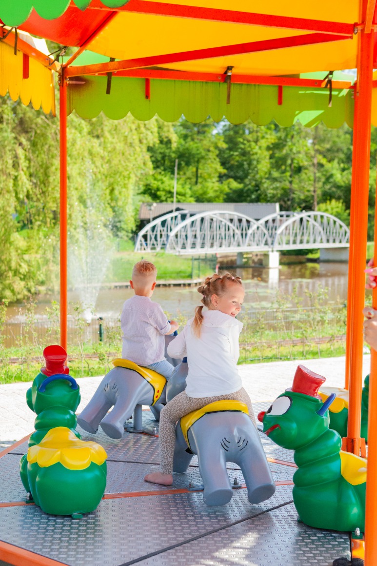 Vol in galop op de speelpaardjes, als een echte boer op de tractor, van de reuzenglijbaan, kliederen bij de zand- en waterplaats, spring zo hoog als je kunt op het luchtkussen en vlieg hoog in de wolken, met uitzicht over het hele park vanuit de helikopter.