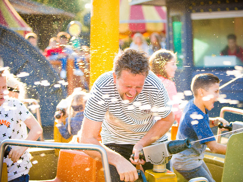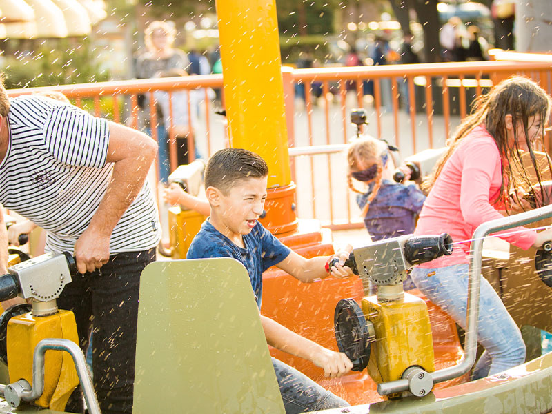 Liebe Eltern, macht euch keine Sorgen. Es gibt sichere und trockene Plätze, an denen ihr die Kinder von der Seite aus anfeuern könnt. Oder ihr nehmt selbst an der Wasserschlacht in dieser Attraktion teil. (P.S. Es gibt auch die Möglichkeit, von der Seitenlinie aus einen kleinen Beitrag zur Schlacht zu leisten.)