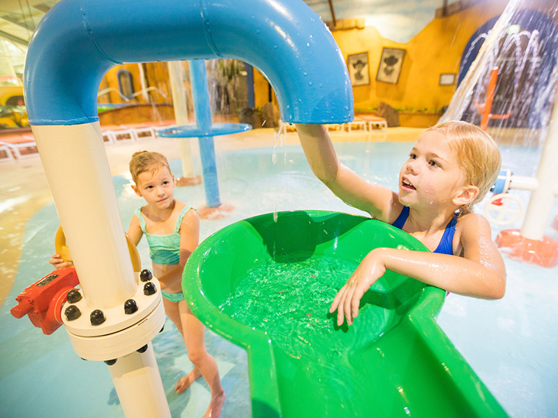 Die (aller)Kleinsten vergnügen sich im Wasserspielplatz, während Sie aufpassen und Ihre Füße baden. Entspannen Sie sich im Whirlpool und genießen Sie die tropische Atmosphäre.