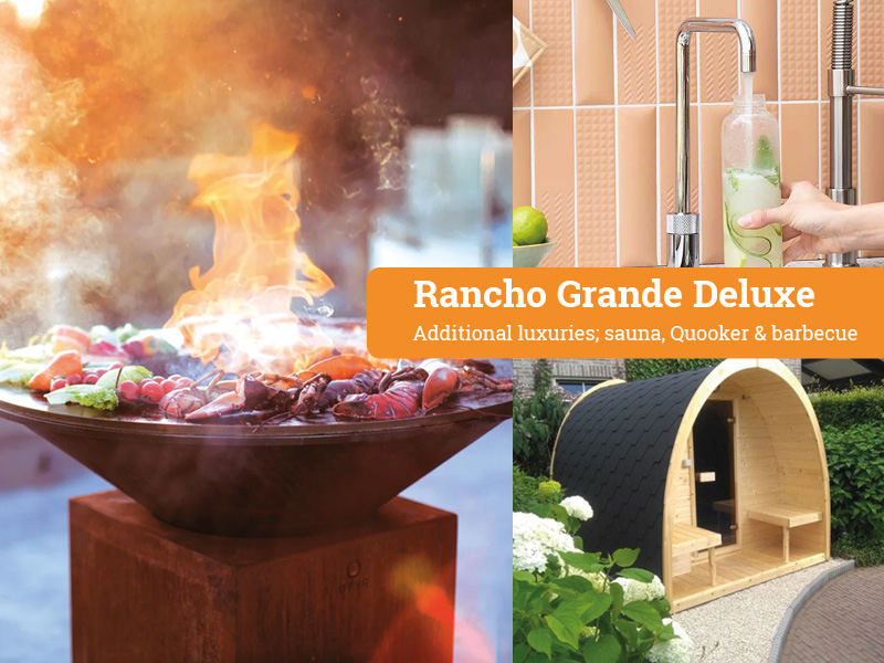 This accommodation is besides luxurious also completely gas-free and sustainably built. The Rancho Grande Deluxe has the following luxurious aspects in comparison to the Rancho Grande. An outdoor sauna will give you the welcoming warmth and relaxation after a long day. Enjoy 2 additional smart TVs in the master bedrooms, a larger TV in the living room and luxurious bedding in the large bedrooms. Relax on two loungers outside, and listen to music with the Bluetooth sound system. At night you can enjoy a delicious BBQ or a crackling fire on the terrace. Step outside and discover the beautifull surroundings and the theme park a 10-minute walk away. A perfect setting for an unforgettable stay!