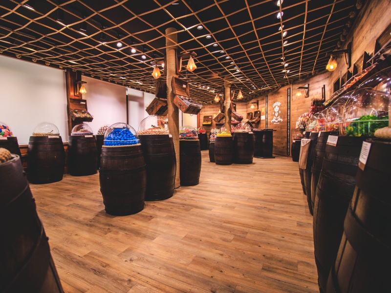 Wie snoepjes wil kopen, kan het scheppen uit de vele vaten en houten schatkisten. Het assortiment is anders dan het snoep in Sweeny’s Sweeties in de Main Street.